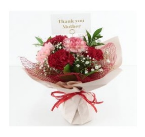 「ハーティー(レッド)」は、母の日定番の赤やピンク系のカーネーションをメインに束ねたスタンディングブーケ。価格は3500円。