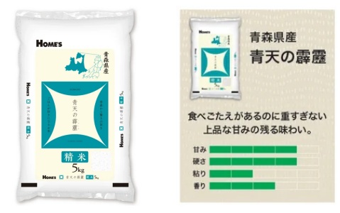 「HOME’S 青森県産 青天の霹靂 精米5kg」は、粒は大きくシャープで、しゃきっとした見た目が特徴。適度に粒感があり、さっぱりとした甘みとキレのある味わいが楽しめる。どんなおかずの味わいも引き立てる。価格は4580円(本体価格、以下同)。