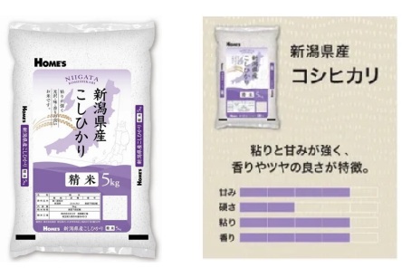 「HOME’S 新潟県産 コシヒカリ 精米5kg」は、しっかりとした甘みが口に広がり、粘りが強くもちもちとした食感が楽しめる。口当たりが柔らかく、子どもから高齢者まで幅広くおすすめできる味わい。時間が経っても軟らかさが続くので、おにぎりや弁当にも適する。価格は3980円。