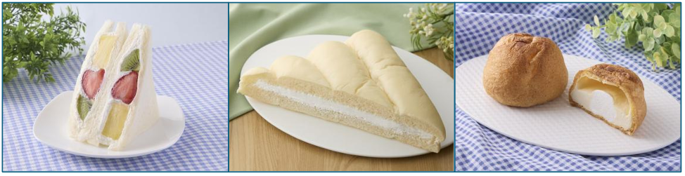 17日から発売するのは「北海道ミルクシュークリーム」138円(本体価格、以下同)、「北海道ミルク杏仁」180円、「北海道ミルクのビッグシューアイス」160円。24日からは「3種のフルーツサンド」398円、「ダブルミルクロールパン」148円、「ふんわり三角サンド(ミルク)」148円、「もちまる焼き 北海道ミルク」158円。