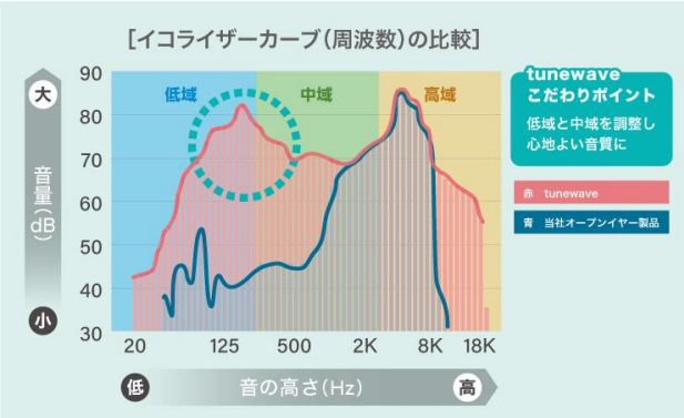 「tunewave」は、サウンドデザイナーの沖田純之介氏が音質を監修した耳掛け型オープンイヤーイヤホン。従来のオープンイヤー製品では聞こえにくい低域と中域を調整し「良い」と感じる音のバランスを維持、歌の子音などの高域も上げ「抜け感」を意識した音質を追求した。また、音源プラットフォームごとの音量差やバランス差に配慮したイコライザー設計を採用し、若者の耳を守るため過度な音量に頼らなくてもクリアに聴こえる音質を制作した。同等レベルの音質チューニングが施されたオープンイヤーイヤホンは 1万5000 円~2万円前後が主流だが、若者が日常使いできるように 5000円以下という低価格帯にもこだわった。