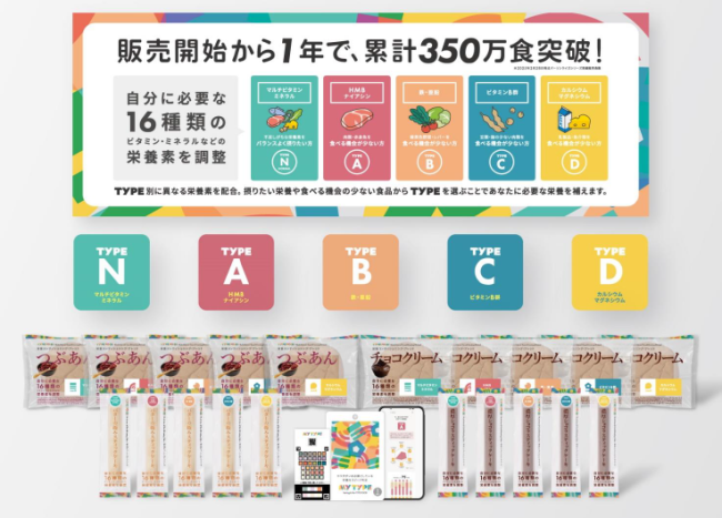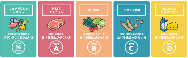 栄養タイプは、2800件の栄養データを基に設計された5つのタイプ(N・A・B・C・D)に 分類される。判定結果と同じタイプの商品を選ぶことで、不足しがちな栄養素を効率的に補うことができる。商品には、全27種類の栄養素のうち効率的に摂取できる16種類を配合している。販売開始から1年で350万食を突破し、パーソナライズフード売上げNo.1を獲得している。