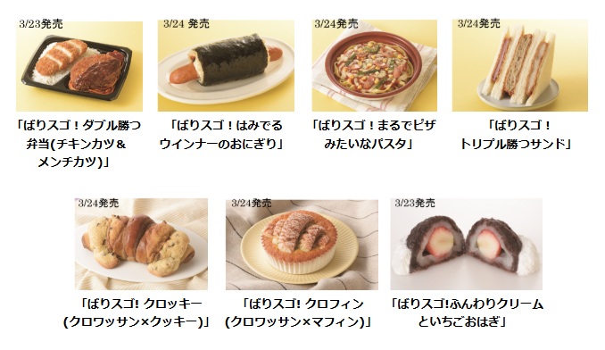 チキンカツ、メンチカツの2種類のカツが味わえる「ばりスゴ!ダブル勝つ弁当(チキンカツ&メンチカツ)」697円(税別価格、以下同)、てりやきソースとマヨネーズを合わせたペッパーライスで、ウインナーをまるごと1本巻いた「ばりスゴ!はみでるウインナーのおにぎり」322円、フィットチーネに、ベースのトマトソース・チーズ・ソーセージ・コーン・ピーマンなど彩りよくトッピングしたピザのような「ばりスゴ!まるでピザみたいなパスタ」646円、メンチカツ、とんかつ、ハムカツの3種類のカツを中具に使用した「ばりスゴ!トリプル勝つサンド」419円、チョコチップ入りのクッキー生地を、クロワッサン生地とフランスパン生地を交互に巻きこんだ生地で包んで焼いた「ばりスゴ! クロッキー(クロワッサン×クッキー)」180円、チョコシートを折り込んだクロワッサンの上にビスケット生地をトッピングして、マフィンと合わせて焼いた「ばりスゴ! クロフィン(クロワッサン×マフィン)」199円、北海道産小豆を使用した甘さ抑えめのつぶあんと佐賀県産のもち米を使ったおはぎで新鮮ないちごを丸ごと1個包み、ホイップクリームと合わせたハイブリッドスイーツ「ばりスゴ!ふんわりクリームといちごおはぎ」298円の7品を発売する。