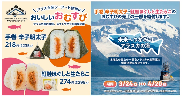 (株)ファミリーマート(東京都港区、小谷建夫社長)は3月24日(火)から、持続可能な漁業を実現しているアラスカ産のシーフード原料を使用したおむすび「紅鮭ほぐしと生たらこ」と「手巻 辛子明太子」を、全国のファミリーマート約1万6400店舗で発売する。