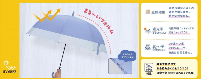 近年、子どもの熱中症対策として日傘の需要が高まるなか、イオンは晴雨兼用傘のラインアップを拡充する。荷物ごと体を包み込む丸いフォルムが特長で、通学時の強い日差しや急な雨にも対応する。傘の生地は、熱中症対策として、内側PU黒コーディングによる遮光率99.99%以上、日焼け対策としてUV遮蔽率99.9%以上の機能付き。