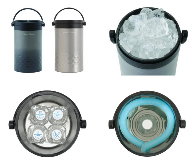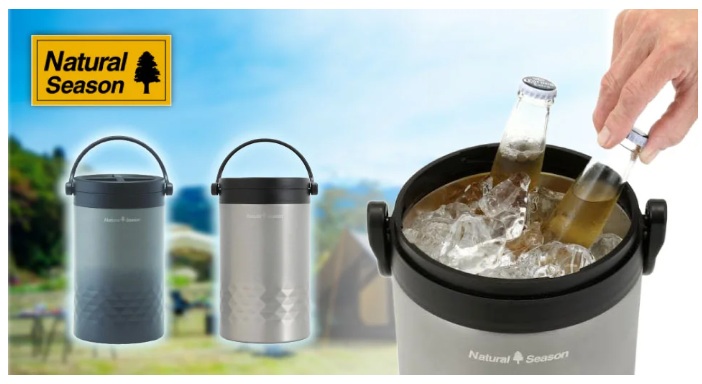 「Natural Season アウトドア アイスストレージ 5.5L」は、ステンレス製真空2重構造の5.5Lの大容量なので、氷なら2㎏、500mlのペットボトルは4本立てて持ち運べる。また保冷だけでなく寒い季節には保温にも使える。保冷効力は6.5℃以下(6時間)、保温効力は73℃以下(6時間)。