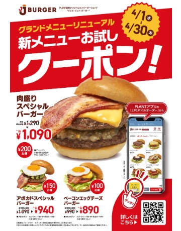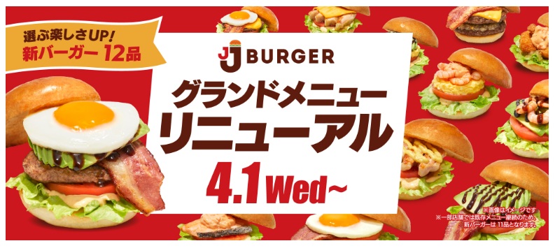 (株)PLANT(福井県坂井市、三ッ田泰二社長)は4月1日(水)から、「JJ BURGER」のグランドメニューをリニューアルする。