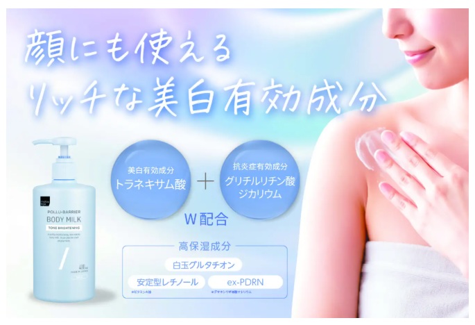 有効成分「トラネキサム酸」を、同社の医薬部外品PB商品において、最高濃度量で配合。抗炎症有効成分「グリチルリチン酸ジカリウム」のW配合により、全身美白と肌荒れケアを同時に叶える。そのほかグルタチオンや安定型レチノール、PDRNなどを配合し、うるおいを与えなめらかな肌へ導く。