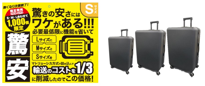 高騰するキャリーケース市場の中、「驚安キャリーケース」は余計な機能を省き、必要最低限に絞ることで、安く移動したいというニーズに応えた低価格モデルとなる。3サイズ全部買っても1万円以下となる。