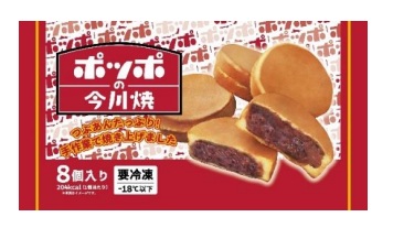 「ポッポの今川焼 8個入り」は、熟練の職人が製造工場で一つひとつ丁寧に手焼きで仕上げた今川焼。薄皮の生地に、甘さを控えたあんこの配合を70%まで高めた、たっぷりあんこを楽しめる商品。価格は599円(本体価格、以下同)。