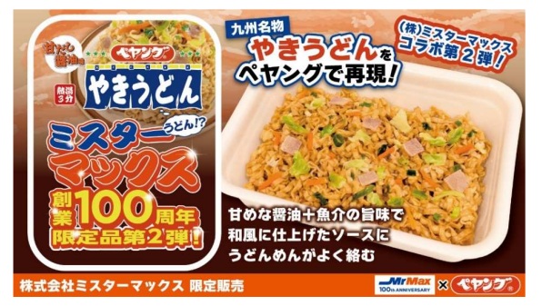 (株)ミスターマックス(福岡県福岡市、平野能章社長)は4月9日(木)から、まるか食品(株)(群馬県伊勢崎市、丸橋克守社長)との限定コラボ商品第2弾となる「ペヤングやきうどん 甘だし醤油味」を、MrMax全60店舗とオンラインストアで発売を開始した。同日より、昨年10月に発売した第1弾の「ペヤング 甘辛味噌醤油味」も数量限定で再販する。