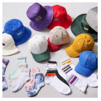 「ハット」全9種で各500円、「キャップ」全9種で各300円、「ソックス」全15種で各100~200円。