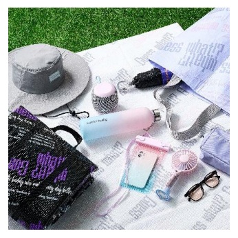 「レジャーシート」全2種で各500円、「折りたたみ傘」全2種で各1000円、「ウォーターボトル」全2種で各500円、「スマートフォン防水ケース」全2種で各300円、「ミスト付ハンディ扇風機」全3種で各1000円、「サングラス」全9種で各100~200円。