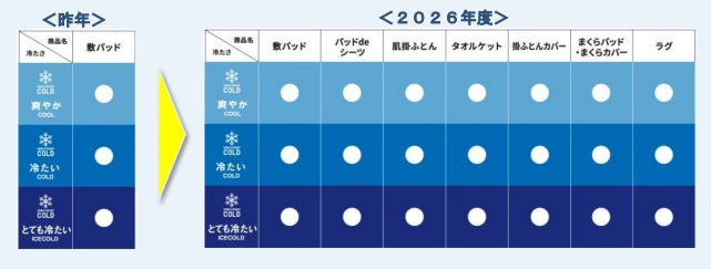 また、3段階の冷たさから選べる商品カテゴリは、昨年の敷パッドに加え、肌掛ふとん・まくらパッドなど7種類に拡充する。