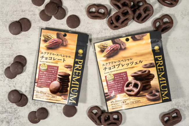 今回発売されるのは、同シリーズ初となるプレッツェル商品「エクアドル・スペシャル チョコプレッツェル」(368円:税込み、以下同)。香ばしいプレッツェルにチョコをコーティングし、塩味とのコントラストを楽しめる仕立てとした。また、チョコレートそのものの味わいを楽しめる「エクアドル・スペシャル チョコレート」(330円)も同時発売する。