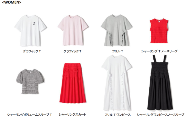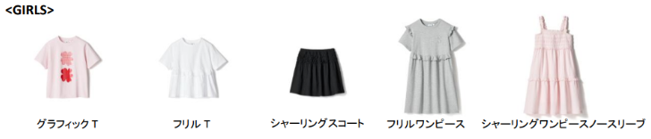 商品ラインナップは、ウィメンズ 8アイテム、ガールズ5アイテム。ウィメンズは「カットソー」1990~2990円、「スカート」4990円、「ドレス」3990~5990円。ガールズは「カットソー」1290~1500円、「スコート」2490円、「ドレス2990~3990円」。