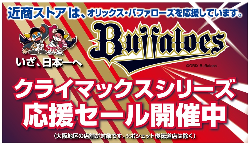 近鉄グループの(株)近商ストア(大阪府松原市、上田泰嗣社長)は、オリックス・バファローズのクライマックスシリーズを応援するため、10月8日(水)からクライマックスシリーズ期間中、近商ストア・ハーベスの大阪地区対象店舗19店舗にて、「クライマックスシリーズ応援セール」を開催する。