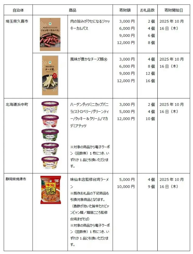年末にかけてふるさと納税の需要が高まる中、今回「ハーゲンダッツ」ブランドの「ミニカップバニラ(北海道浜中町)」や、おつまみとしても人気の「風味が豊かなチーズ鱈®(埼玉県久喜市)」、人気のカップ麺が冷凍麺になった「味仙本店監修台湾ラーメン(静岡県焼津市)」など8商品を追加した。お礼品全体として24自治体64商品に拡大した。