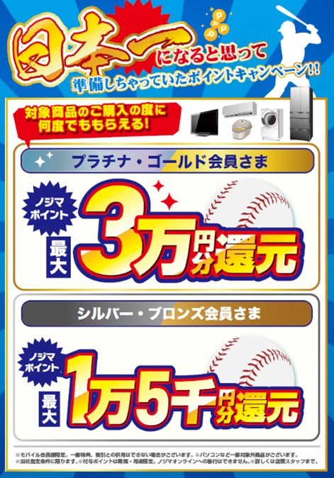 ノジマモバイル会員ランクに応じて、対象商品の購入で最大1万5000~3万円分のポイントを還元する。そのほか横浜DeNAベイスターズのサイングッズや家電が当たる「横浜DeNAベイスターズ大抽選会」なども開催する。ノジマ店舗で合計3000円以上(税込価格)の買い物をし、ノジマアプリよりエントリーすることで参加可能となる。