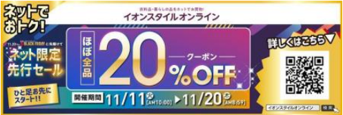 さらに店舗でのセールを前に、11月11日(火)~11月20日(木)の期間に「イオンスタイルオンライン先行セール」を開催する。オンライン限定商品から、衣料品・日用品などのアイテムまで、「ほぼ全品」20%OFFとなる割引クーポンを配布する。先行セールでは過去最高の割引率となる。