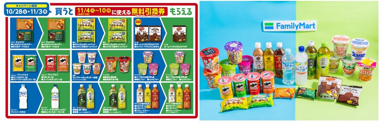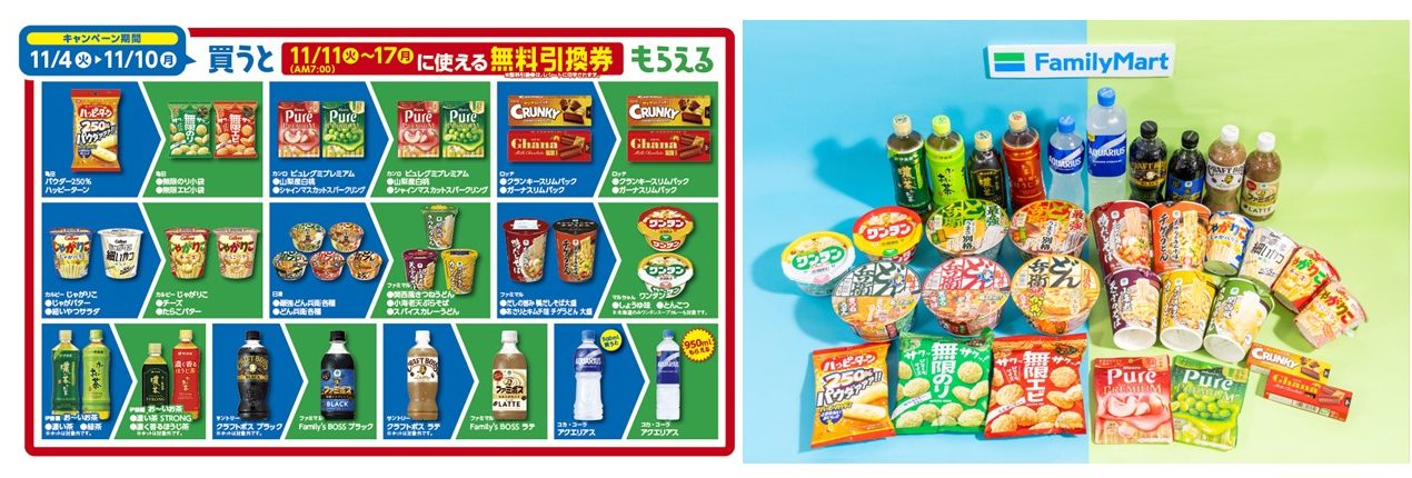 また第2週(11月4日~11月10日)の対象商品は「伊藤園 お~いお茶(2品)」「サントリー クラフトボス(2品)」「コカ・コーラ アクエリアス」「亀田 ハッピーターン」「カンロ ピュレグミプレミアム(2品)」「ロッテ クランキー・ガーナ」「カルビーじゃがりこ(2品)」「日清 どん兵衛(2品)」「ファミマル カップ麺(2品)」などが対象。