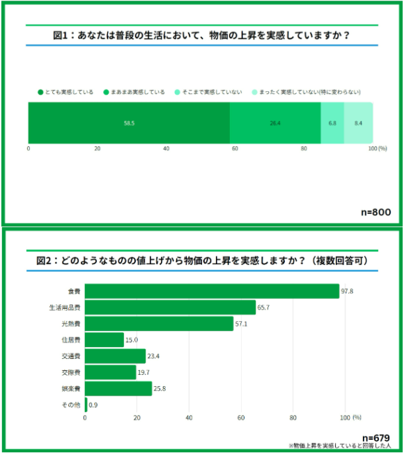 コンビニの節約利用に関する調査結果によると、現在84.9%の人が物価高を「とても実感している(58.5%)」、「まあまあ実感している(26.4%)」と回答している(図1)。その中でも、「食費」の値上げを実感している人が97.8%に上っている(図2)。