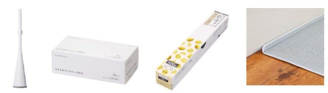 立つほうき1345円(本体価格、以下同)、マイクロファイバークロス20枚270円、ピタッと貼り付くラップ(30㎝×100m)270円、すき間を埋めるキッチンマットL-Fit1163円。