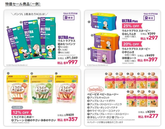 同セールでは、日々の子育てを支える人気アイテムを中心に、厳選40品目以上を特別価格で提供する。ベビーザらスのオリジナルブランド「ウルトラプラス(ULTRA Plus)」シリーズからは、スヌーピーデザインの紙おむつ・おしりふき・手口ふき・除菌シートを特別価格で展開。さらにベビーフード・ベビードリンクも特価で販売する。