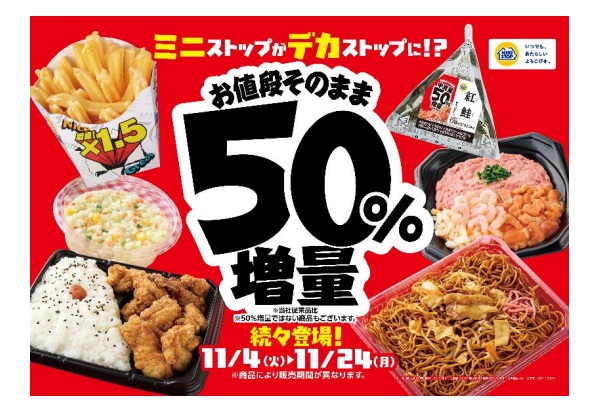 ミニストップ(株)(千葉市美浜区、堀田昌嗣社長)は11月4日(火)から、「ミニストップがデカストップに!?」と題し、お値段そのままの増量フェアを、全国のミニストップ1773店舗で開催している。