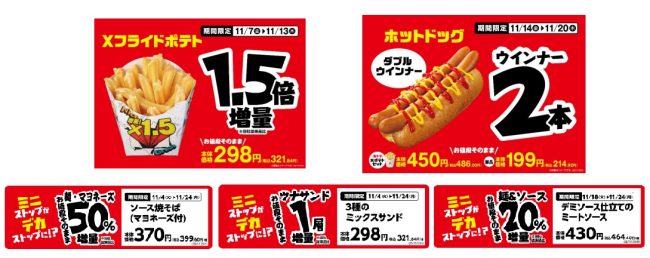 増量フェアでは、Xフライドポテトを1.5倍に、対象のおにぎり、唐揚弁当、納豆巻、海鮮丼、焼きそば、コールスローなどが50%増量、対象の菓子パン、ダブルクリームシューは30%増量する。さらにウインナーを2本入れたホットドッグ(ダブルウインナー)や、対象のサンドイッチ1層増など、全20品の増量商品を順次発売していく。
