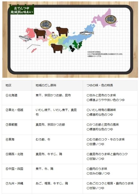 セブン‐イレブンのおでんつゆは、全国7つの地域ごとに食文化に合わせて設計している。北海道の「煮干」、東北・信越の「いわし」、関東の「昆布」、東海の「牛」、関西・北陸「牛、鶏」、中国・四国の「煮干、牛」、九州・沖縄の「あご」と、地域の味を生かしただし原料を使用している。