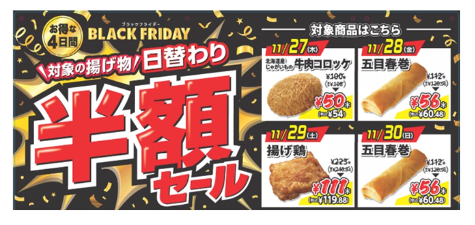 (株)セブン‐イレブン・ジャパン(東京都千代田区、阿久津知洋社長)は、ブラックフライデーに合わせて、対象の揚げ物商品が日替わりで半額になる「揚げ物日替わり半額セール」を全国のセブン‐イレブン(一部除く)で11月27日(火)から30日(日)の4日間限定で開催する。