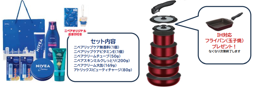 その他にもお買い得商品を用意する。一例として、レディースの「ふわもこパジャマ」やメンズの「デザインドレスシャツ」は半額で提供。またニベア6アイテムがセットになった「ニベアお楽しみセット」は2000円(本体価格、以下同)、「THERMOS IH対応取っ手の取れるフライパン8点セット」は9980円販売され、さらに玉子焼フライパンがもらえる。