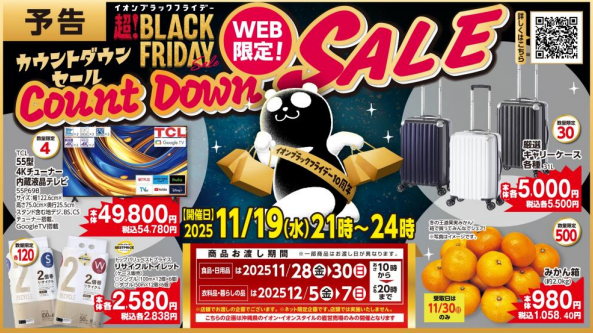 イオングループが実施する「超!ブラックフライデー」に合わせたもの。恒例となったWEB限定セールはEC特設サイトを通じて予約し店舗で受け取るカウントダウンセールを11月19日(水)21時より3時間限定で行った。