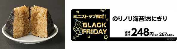 今年は、ブラックフライデーにちなんだ新商品を国内1763店舗で発売している。佃煮とのりで黒づくしに仕上げた「のりノリ海苔!おにぎり」(248円、本体価格以下同)、「黒糖いなり5個」(348円)、「ブラック炒飯&油淋鶏」(648円) 、「ブラックココアメロンパン」(148円)など黒にちなんだ商品10種類を期間限定で揃える。