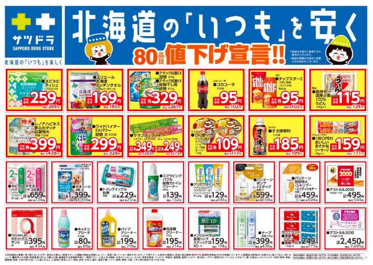 サツドラホールディングスグループの(株)サッポロドラッグストアー(札幌市東区、富山浩樹社長兼CEO)は11月18日(火)から、毎日の暮らしに欠かせない商品を対象に、80品目の値下げを実施する。