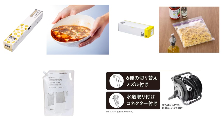 「Everyday Low Price」の代表的な対象商品の一例は、「ピタッと貼り付く食品ラップ 30cm×100m」298円(税込価格、以下同)、「ダブルジッパーバッグS 30枚入り」128円、「部屋干し衣料用液体洗剤2.8㎏」498円、「ホース付きリール20m」2980円など。