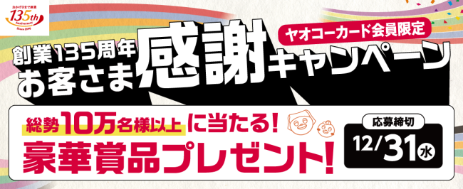 (株)ヤオコー(埼玉県川越市、川野澄人社長)は12月1日(月)から12月31日(水)まで、創業135周年記念のキャンペーンを実施している。総勢10万名以上に抽選で豪華賞品が当たるものでヤオコーカード会員を対象にしている。