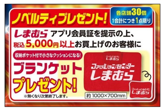 さらに、アプリ会員証を提示の上で税込5000円以上購入のお客を対象に、しまむらオリジナルの「ブランケット」を先着順でプレゼントする。