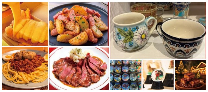 「光の国のクリスマス」では、ジャーマンソーセージにジャーマンポテト、定番のローストビーフやターキーレッグなどの本格的なクリスマスメニューや、クリスマスキャンドルスタンドやドイツ直輸入のギフトやスノードームなどのグッズを販売する。