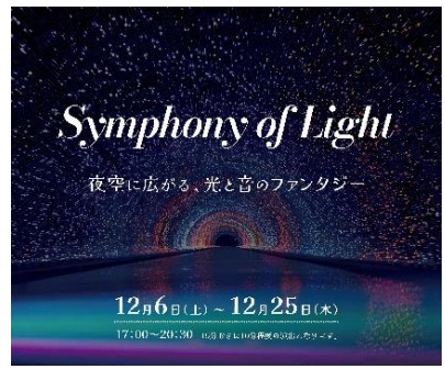 そのほか、昼は「シャボン玉ワールド」を、夜はレーザーと音楽が夜空を彩る、光と音のファンタジーイルミネーション「Symphony of Light」を開催する。期間中の17:00~21:00に、15分おきに10分程度演出する。