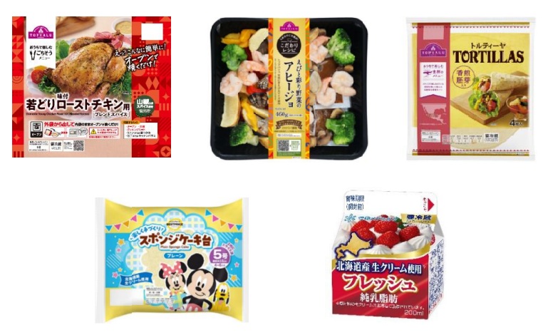 イオンのPB「トップバリュ」からは、「若どり味付ローストチキン用(ブレンドスパイス)」1280円/1羽(855g)(本体価格、以下同)や「えびと彩り野菜のアヒージョ」1380円/460g、今話題の「トルティーヤ 香煎胚芽入り」258円/4枚入りなどを用意する。また、自宅で簡単に楽しくケーキを手作りできるよう、スポンジケーキ(438円)や生クリーム(385円)なども用意する。