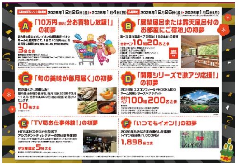 「イオンン北海道の超!初売り」では、初夢が抽選で叶う「イオンで初夢大チャンス」や「福カート」、日々の生活に役立つ「暮らしの品の均一祭」や新年の食卓を華やかに彩る「新春ごちそうメニュー」など多数品揃えている。また、自宅でもゆっくり新年の買物をという方に、eショップでも初売り商品を用意している。