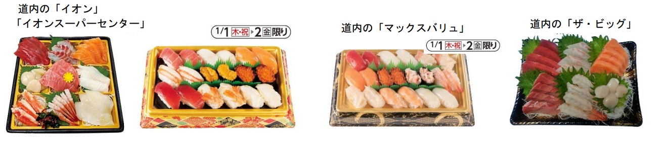 イオン北海道(株)(札幌市白石区、青栁英樹社長)は、1月1日(木・祝)から4日(木)まで、「イオン」「イオンスーパーセンター」47店舗、「マックスバリュ」「フードセンター」65店舗、イオン北海道のインターネットショップ「eショップ」で、「イオンン北海道の超!初売り」を開催する。また、「ザ・ビッグ」26店舗も1月1日(木・祝)から営業し、刺身などの新春ごちそうメニューを品揃える。