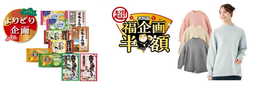 衣料品・暮らしの品「福企画」は、今ついている本体価格からレジにて半額になるほか、よりどり企画も開催する。