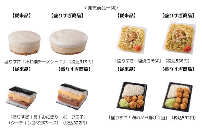 7回目となる今回の「盛りすぎチャレンジ」では、過去に開催した際に人気だったおにぎり・調理パン・調理麺・店内調理弁当・デザートといった計35品を発売する。