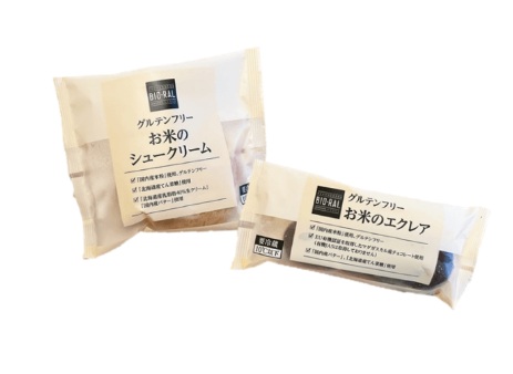 国産米粉を使用したグルテンフリーのシュークリームとエクレア。シュークリームは、素材にもこだわり「北海道産のてん菜糖」「北海道産生クリーム」「国産バター」が生み出すやさしい味わいが特徴。エクレアはちょっとビターで香り豊かな濃い風味を味わえるマダガスカル産チョコレートを使用。