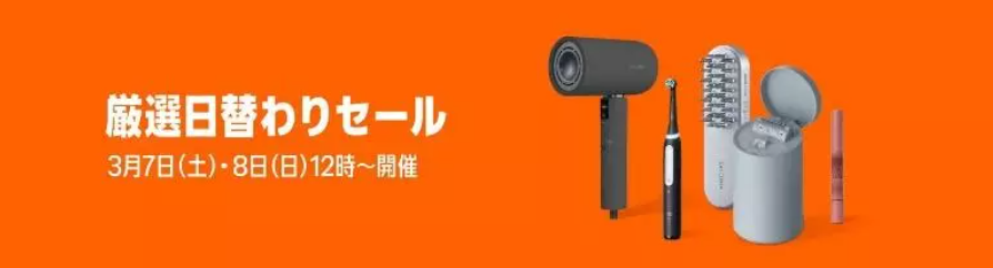 さらに、3月7日(土)正午から3月8日(日)午前11時59分、3月8日(日)正午~ 3月9日(月)午前11時59分までの2回にわたり家電からスポーツ用品、ベビー用品など、幅広いカテゴリーの人気商品を毎日日替わり24時間限定で届ける「厳選日替わりセール」を開催。Dyson、Logicool G、パンパース、SALONIAなど、人気ブランドの商品を参考価格から30%以上の割引で提供する。