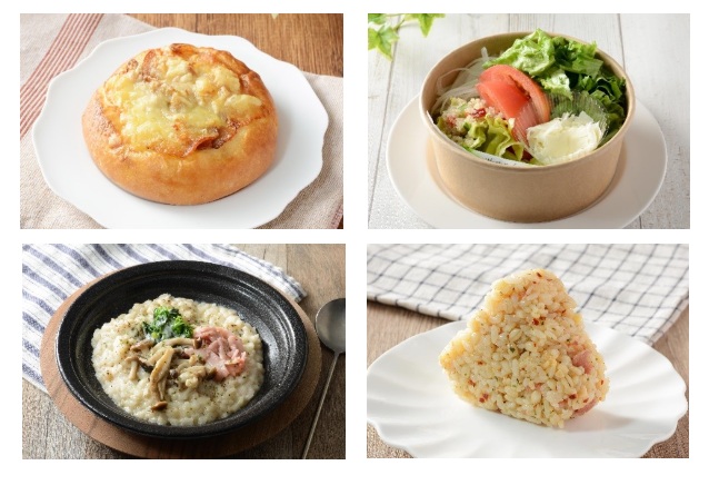 2月17日(火)から発売する商品は、上段左から「ベーコンとチーズのフォカッチャ」383円(税込価格、以下同)、「オリーブオイルで食べるトマトとチーズのサラダ」646円、下段左から「トリュフ仕立てのチーズリゾット (もち麦入りご飯)」599円、「ペペロンチーノ風 もち麦入りおにぎり」184円の4品。