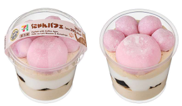 「にゃんパフェ」は甘いカフェオレムースに、ほろ苦いぷるぷる食感のコーヒー寒天、軽いくちどけのミルクムース、なめらかなカフェオレホイップを重ね、ピンク色の肉球をイメージした団子とミルクあんホイップ大福をトッピングする。価格は362円。販売期間は2月16日~22日で、沖縄県を除く全国で販売する。